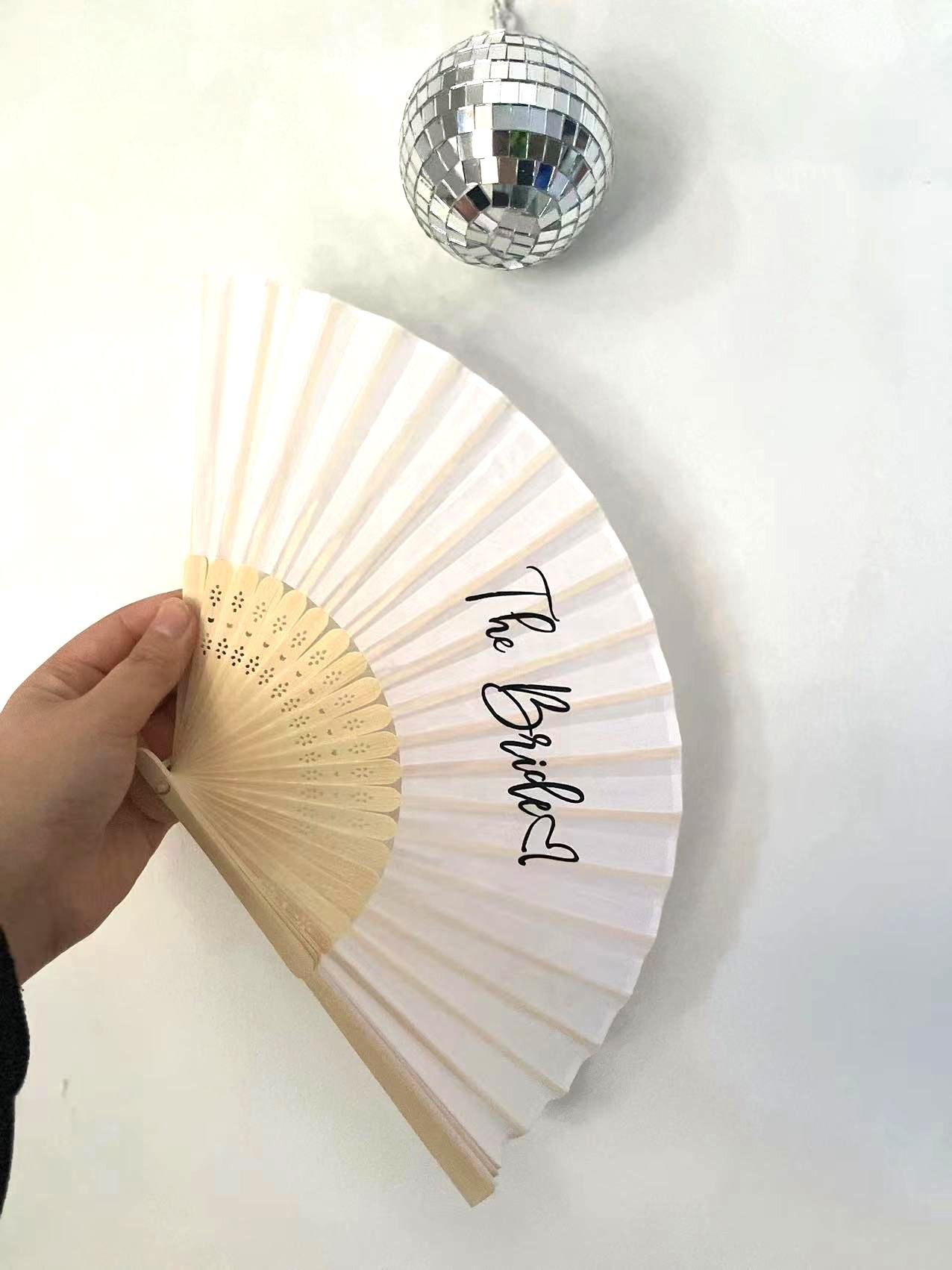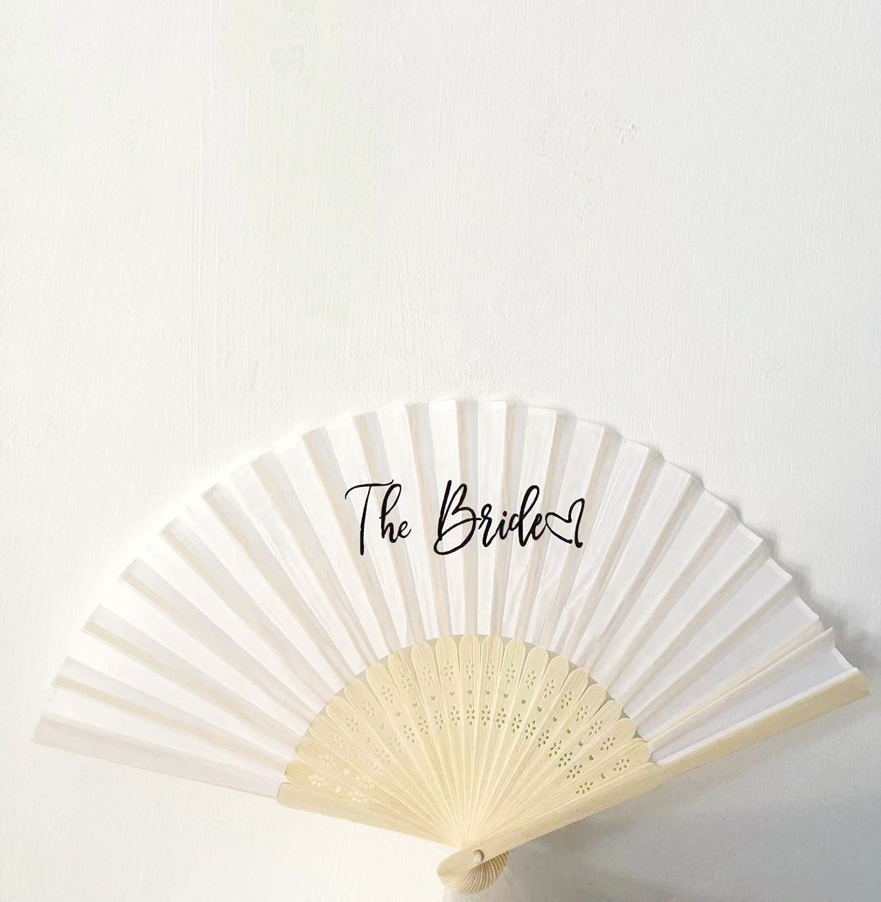 Este abanico blanco con detalles dorados y la frase “The Bride” es el accesorio ideal para mantener la calma y el estilo durante la boda, la sesión de fotos o la despedida.