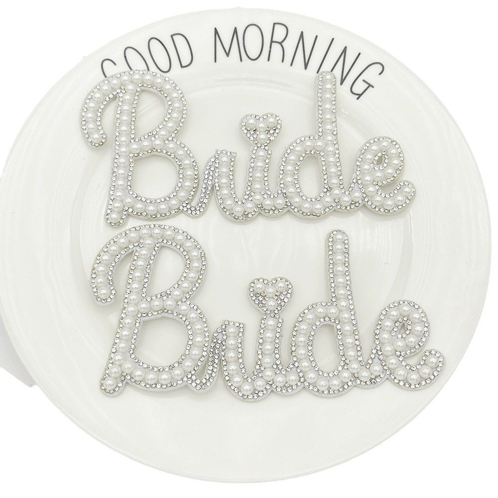 Este parche bordado con la palabra “Bride” está decorado con perlas y bordes de strass, perfecto para personalizar batas, bolsos, pijamas o cajas de regalo. Se puede coser o adherir con pegamento textil.