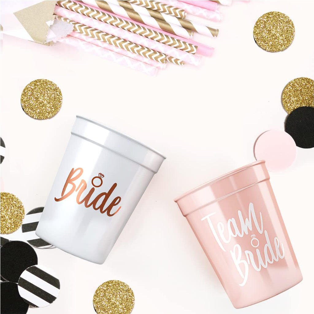 Este set incluye 10 vasos de plástico reutilizable con acabados brillantes y frases perfectas para celebrar en grande: uno blanco con la palabra “Bride” y nueve rosados con “Team Bride”.